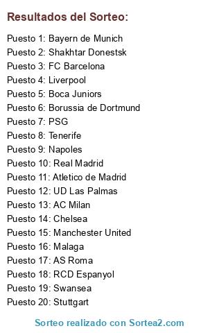 Lista de participantes: Borussia de Dortmund, Manchester United, Shakhtar Donestsk, Real Madrid, Chelsea, FC Barcelona, Tenerife, Bayern de Munich, AS Roma, Swansea, Malaga, Boca Juniors, UD Las Palmas, Atletico de Madrid, Napoles, AC Milan, PSG, Liverpool, RCD Espanyol, Stuttgart.