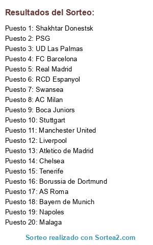 Lista de participantes: Borussia de Dortmund, Manchester United, Shakhtar Donestsk, Real Madrid, Chelsea, FC Barcelona, Tenerife, Bayern de Munich, AS Roma, Swansea, Malaga, Boca Juniors, UD Las Palmas, Atletico de Madrid, Napoles, AC Milan, PSG, Liverpool, RCD Espanyol, Stuttgart.