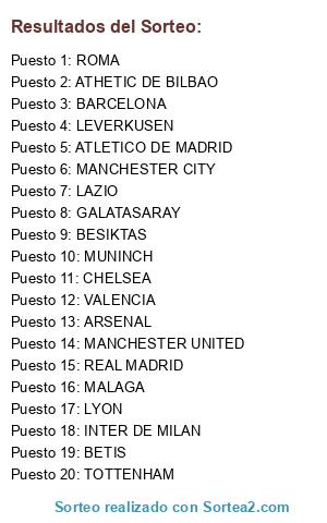 Lista de participantes: BARCELONA, ATLETICO DE MADRID, MALAGA, BETIS, ATHETIC DE BILBAO, ARSENAL, CHELSEA, REAL MADRID, MANCHESTER CITY, TOTTENHAM, INTER DE MILAN, VALENCIA, ROMA, LAZIO, MANCHESTER UNITED, LEVERKUSEN, MUNINCH, LYON, GALATASARAY, BESIKTAS.