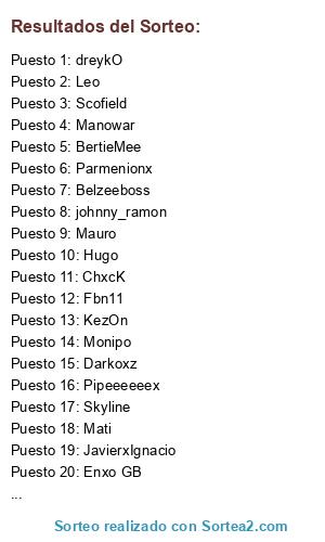 Lista de participantes: KezOn, ChxcK, XUnXoOThebesT, Rooney_gb, Mauro, NachoAlbo, Fbn11, Manowar, Scofield, Maxwell2, Parmenionx, Darkoxz, Enxo GB, Mati, Ibra213, Hugo, Belzeeboss, Monipo, Pirata, Trakatraka, Skyline, Leo, BertieMee, johnny_ramon, JavierxIgnacio, PokeFlay!, Pipeeeeeex, dreykO.