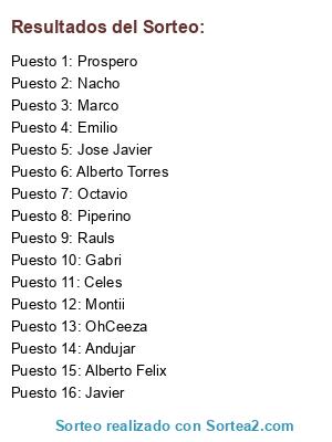 Lista de participantes: Marco, Alberto Torres, Alberto Felix, Andujar, Piperino, Celes, Emilio, Gabri, Javier, Jose Javier, Montii, Rauls, Nacho, Octavio, OhCeeza, Prospero.