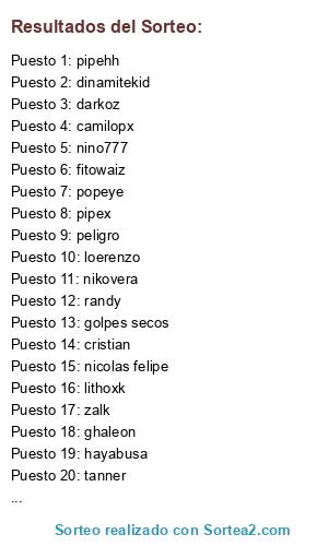 Lista de participantes: cristian, negro22, mojadito, dinamitekid, camilopx, ghaleon, leoxth, tiwinky, fitowaiz, xepa, tanner, aioria, darkoz, zalk, nino777, pipehh, peligro, seab, nicolas felipe, randy, alboadicto, pipex, loerenzo, popeye, nikovera, golpes secos, hayabusa, alex valdivieso, willed, lithoxk.