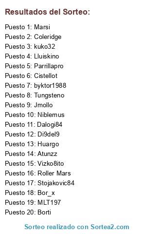 Lista de participantes: Di9del9, Lluiskino, Huargo, Stojakovic84, Atunzz, Coleridge, MLT197, Bor_x, byktor1988, Marsi, Vizko8ito, kuko32, Roller Mars, Jmollo, Tungsteno, Borti, Cistellot, Albertt92, Parrillapro, Niblemus, Dalogi84.
