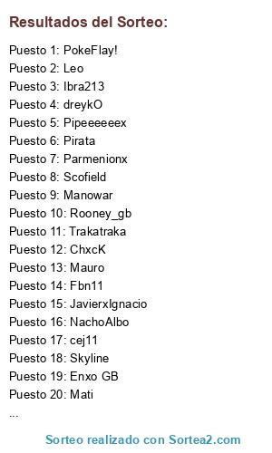 Lista de participantes: KezOn, ChxcK, XUnXoOThebesT, Rooney_gb, Mauro, NachoAlbo, Fbn11, Manowar, Scofield, Maxwell2, Parmenionx, Darkoxz, Enxo GB, Mati, Ibra213, Hugo, Belzeeboss, Monipo, Pirata, Trakatraka, Skyline, Leo, BertieMee, johnny_ramon, JavierxIgnacio, PokeFlay!, Pipeeeeeex, dreykO, cej11.