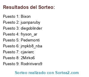 Lista de participantes: Bixon, diegoblinder, fryson_ar, juanparuby, Rodririvero9, jmpkb8_nba, Pedemonti, 2Mirko6, cjavierc.