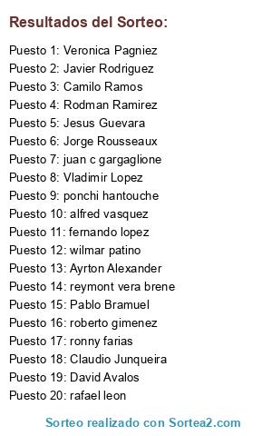 Lista de participantes: Claudio Junqueira, Jesus Guevara, Veronica Pagniez, Jorge Rousseaux, fernando lopez, Javier Rodriguez, wilmar patino, ronny farias, reymont vera brene, rafael leon, Camilo Ramos, Ayrton Alexander, Vladimir Lopez, Pablo Bramuel, David Avalos, alfred vasquez, ponchi hantouche, roberto gimenez, juan c gargaglione, Rodman Ramirez.