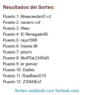 Lista de participantes: MoRTaLChRiiiiS, ZIDANEx7, navarro vcf, El Renegado95, Dailetc, RaaBascO15, Iniesta l8l, AbeeceedariO v2, piturm, fifero, rayo1969, er gomez.