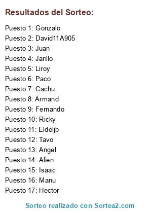 Lista de participantes: Ricky, Paco, Armand, Eldeljb, Liroy, Cachu, Angel, Alien, Isaac, Hector, Gonzalo, Juan, Fernando, Jarillo, Manu, Tavo, David11A905.