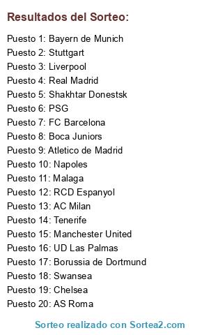 Lista de participantes: Borussia de Dortmund, Manchester United, Shakhtar Donestsk, Real Madrid, Chelsea, FC Barcelona, Tenerife, Bayern de Munich, AS Roma, Swansea, Malaga, Boca Juniors, UD Las Palmas, Atletico de Madrid, Napoles, AC Milan, PSG, Liverpool, RCD Espanyol, Stuttgart.