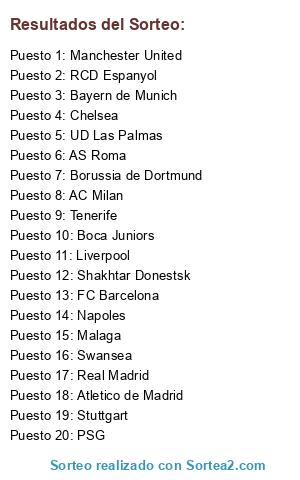 Lista de participantes: Borussia de Dortmund, Manchester United, Shakhtar Donestsk, Real Madrid, Chelsea, FC Barcelona, Tenerife, Bayern de Munich, AS Roma, Swansea, Malaga, Boca Juniors, UD Las Palmas, Atletico de Madrid, Napoles, AC Milan, PSG, Liverpool, RCD Espanyol, Stuttgart.
