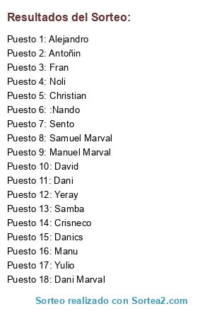 Lista de participantes: Samba, David, Manuel Marval, Danics, Fran, Sento, Yulio, Noli, Alejandro, :Nando, Christian, Antoñin, Manu, Yeray, Dani, Crisneco, Samuel Marval, Dani Marval.