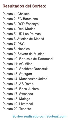 Lista de participantes: Borussia de Dortmund, Manchester United, Shakhtar Donestsk, Real Madrid, Chelsea, FC Barcelona, Tenerife, Bayern de Munich, AS Roma, Swansea, Malaga, Boca Juniors, UD Las Palmas, Atletico de Madrid, Napoles, AC Milan, PSG, Liverpool, RCD Espanyol, Stuttgart.