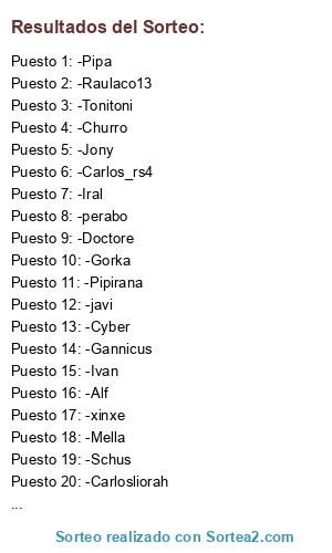 Lista de participantes: -Carlos_rs4, -Carlosliorah, -Gorka, -Alf, -Gannicus, -Doctore, -Cyber, -Oskis, -Schus, -Jony, -Raulaco13, -Churro, -Ivan, -Simarro, -Mella, -Katy, -Julio, -Iral, -Tonitoni, -Pipirana, -Pipa, -xinxe, -perabo, -javi.