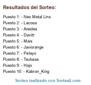 Lista de participantes: - Areides, - Pelayo, - Davitt, - Neo Metal Linx, - Kabron_King, - Lacosa, - Tsubasa, - Mais, - Hojo, - Javiorange.