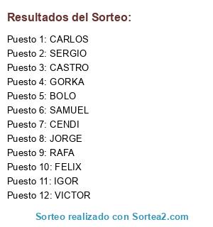 Lista de participantes: BOLO, JORGE, CENDI, CARLOS, FELIX, CASTRO, SAMUEL, VICTOR, SERGIO, IGOR, GORKA, RAFA.