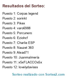 Lista de participantes: x5xFLACCOx5x, Porcunero, Eziohcf, sorinkt, lovelydavisss, Charlie ESP, Juanmalmería, Corpas legend, Alead71, Pikex, varo6988, Nauzet 360.