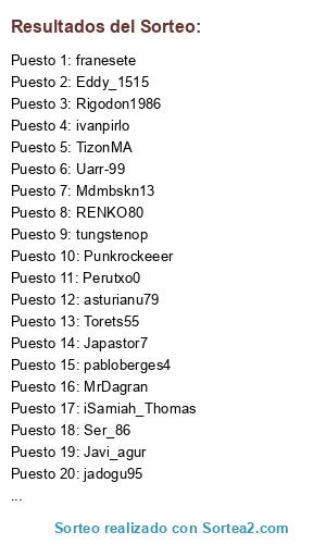 Lista de participantes: ivanpirlo, Perutxo0, Japastor7, Ser_86, franesete, CasaBota_Killer, Uarr-99, tungstenop, Torets55, pabloberges4, RENKO80, Eddy_1515, Mdmbskn13, MrDagran, asturianu79, iSamiah_Thomas, Rigodon1986, Javi_agur, Punkrockeeer, jadogu95, TizonMA.