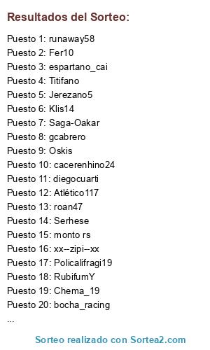 Lista de participantes: Oskis, Jerezano5, Adrian_Xta, bocha_racing, Policalifragi19, Chema_19, Atlético117, dariul, runaway58, xx--zipi--xx, RubifumY, roan47, Fer10, espartano_cai, eljavico, gcabrero, josemarii, Titifano, Klis14, Serhese, Saga-Oakar, diegocuarti, monto rs, cacerenhino24.