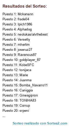 Lista de participantes: Marie, Rober, dwayne1, aGtun, Mckanann, joseruz27, TONIHA83, KobeSFC, Versetty, garciii10, joseqp, Bomba_Navarro11, Ipich1986, mherlim, Ravenous87, tonijaca, Corrup, Alphadog, Ginesgipron, goldplayer_87, frade04, Renko80, ser8ontek, Caniggia, Bogdanovic (ID robertito235), srpeni, AllanKidd (ID AllanKidd5), Juanma, Yraenz, neolukas/alvthebest.
