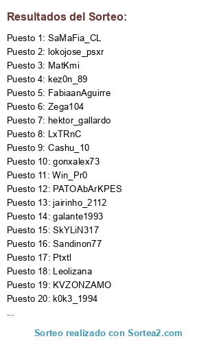 Lista de participantes: kez0n_89, FabiaanAguirre, XunXoOThebesT, jairinho_2112, LxTRnC, KVZONZAMO, SkYLiN317, hektor_gallardo, k0k3_1994, PATOAbArKPES, SaMaFia_CL, Zega104, galante1993, MatKmi, Win_Pr0, Cashu_10, Sandinon77, lokojose_psxr, gonxalex73, Garcia0227, Ptxtl, Leolizana.