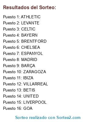 Lista de participantes: UNITED, GOA, CHELSEA, VILLARREAL, LEVANTE, BRENTFORD, BARÇA, LIVERPOOL, ZARAGOZA, BETIS, BAYERN, ESPANYOL, IBIZA, MADRID, ATHLETIC, CELTIC.