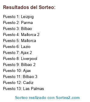 Lista de participantes: Ajax, Ajax 2, Bilbao, Bilbao 2, Bilbao 3, Cadiz, Lazio, Liverpool, Mallorca, Mallorca 2, Parma, Leizpig, Las Palmas.