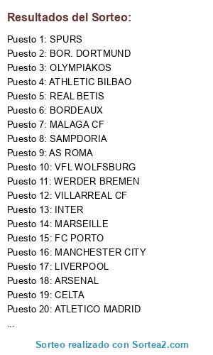 Lista de participantes: AS ROMA, ATLETICO MADRID, BOR. DORTMUND, BORDEAUX, FC BAYERN, INTER, MANCHESTER CITY, SPURS, VFL WOLFSBURG, WERDER BREMEN, ARSENAL, ATHLETIC BILBAO, CELTA, FC PORTO, LIVERPOOL, MALAGA CF, MARSEILLE, OLYMPIAKOS, REAL BETIS, SAMPDORIA, VILLARREAL CF.
