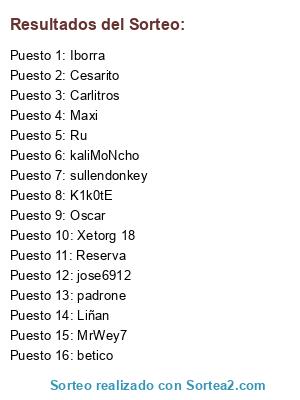 Lista de participantes: Ru, Carlitros, sullendonkey, jose6912, Xetorg 18, Cesarito, Liñan, MrWey7, padrone, Oscar, kaliMoNcho, Maxi, Iborra, betico, K1k0tE, Reserva.