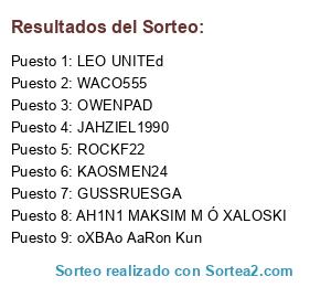 Lista de participantes: ROCKF22, oXBAo AaRon Kun, GUSSRUESGA, KAOSMEN24, AH1N1 MAKSIM M Ó XALOSKI, WACO555, JAHZIEL1990, LEO UNITEd, OWENPAD.