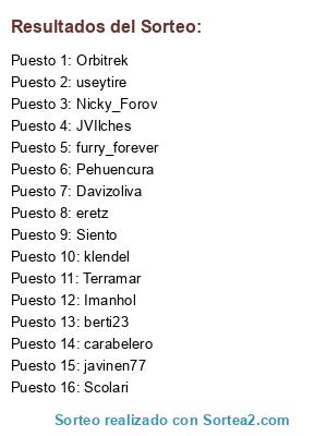 Lista de participantes: Imanhol, javinen77, klendel, Davizoliva, carabelero, furry_forever, Siento, eretz, Orbitrek, Pehuencura, Nicky_Forov, Terramar, Scolari, berti23, useytire, JVIlches.