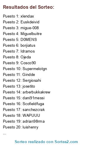 Lista de participantes: Dydak, Scofieldfuga, adrian98rma, Ojeda, Idramos, sanchezcrak, xlendax, luishenry, spartan90, dani91messi, D0MENS, borjiatus, josetito, manololl, Miguelbuitre, Euskdeivid, arberbukkakrew, Sergiosahi, Cosco90, WAPUUU, Supermelotgn, Gindde, migue-008.