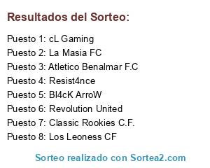 Lista de participantes: Revolution United, Los Leoness CF, cL Gaming, Resist4nce, Classic Rookies C.F., La Masia FC, Bl4cK ArroW, Atletico Benalmar F.C.