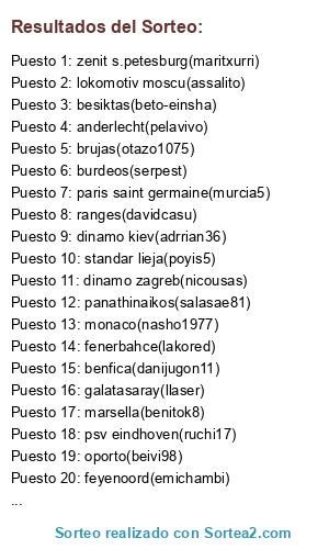 Lista de participantes: burdeos(serpest), lyon(pegaso111), marsella(benitok8), monaco(nasho1977), paris saint germaine(murcia5), ajax(patrickmarquez), feyenoord(emichambi), psv eindhoven(ruchi17), anderlecht(pelavivo), brujas(otazo1075), aek atenas(lopesof), olympiakos(soy_tu_ano), panathinaikos(salasae81), benfica(danijugon11), oporto(beivi98), sporting lisboa(stinpy), lokomotiv moscu(assalito), celtic(erik042), ranges(davidcasu), besiktas(beto-einsha), fenerbahce(lakored), galatasaray(llaser), shaktar donest(javigalvan), dinamo kiev(adrrian36), dinamo zagreb(nicousas), standar lieja(poyis5), zenit s.petesburg(maritxurri), copenague(maykelillo9).