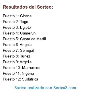 Lista de participantes: Costa de Marfil, Ghana, Argelia, Egipto, Senegal, Nigeria, Camerun, Sudafrica, Tunez, Marruecos, Angola, Togo.