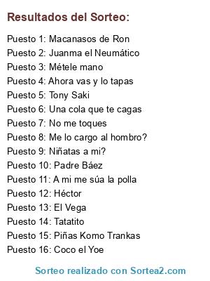 Lista de participantes: Tatatito, Padre Báez, Tony Saki, Métele mano, Me lo cargo al hombro?, Coco el Yoe, Macanasos de Ron, Ahora vas y lo tapas, No me toques, El Vega, Una cola que te cagas, Piñas Komo Trankas, Héctor, A mi me súa la polla, Juanma el Neumático, Niñatas a mi?.