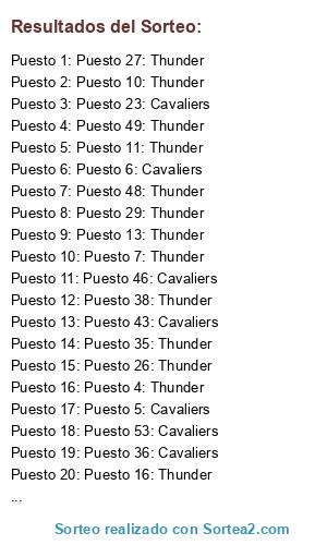 Lista de participantes: Puesto 1: Thunder, Puesto 2: Cavaliers, Puesto 3: Thunder, Puesto 4: Thunder, Puesto 5: Cavaliers, Puesto 6: Cavaliers, Puesto 7: Thunder, Puesto 8: Thunder, Puesto 9: Cavaliers, Puesto 10: Thunder, Puesto 11: Thunder, Puesto 12: Thunder, Puesto 13: Thunder, Puesto 14: Cavaliers, Puesto 15: Thunder, Puesto 16: Thunder, Puesto 17: Thunder, Puesto 18: Cavaliers, Puesto 19: Thunder, Puesto 20: Thunder, Puesto 21: Cavaliers, Puesto 22: Cavaliers, Puesto 23: Cavaliers, Puesto 24: Cavaliers, Puesto 25: Thunder, Puesto 26: Thunder, Puesto 27: Thunder, Puesto 28: Thunder, Puesto 29: Thunder, Puesto 30: Thunder, Puesto 31: Thunder, Puesto 32: Thunder, Puesto 33: Thunder, Puesto 34: Thunder, Puesto 35: Thunder, Puesto 36: Cavaliers, Puesto 37: Thunder, Puesto 38: Thunder, Puesto 39: Thunder, Puesto 40: Thunder, Puesto 41: Thunder, Puesto 42: Thunder, Puesto 43: Cavaliers, Puesto 44: Thunder, Puesto 45: Cavaliers, Puesto 46: Cavaliers, Puesto 47: Thunder, Puesto 48: Thunder, Puesto 49: Thunder, Puesto 50: Thunder, Puesto 51: Cavaliers, Puesto 52: Cavaliers, Puesto 53: Cavaliers, Puesto 54: Thunder, Puesto 55: Thunder, Puesto 56: Cavaliers.
