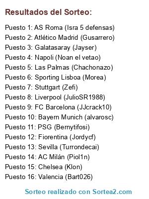 Lista de participantes: PSG (Bernytifosi), Stuttgart (Zefi), Las Palmas (Chachonazo), Fiorentina (Jordycf), Atlético Madrid (Gusarrero), Bayern Munich (alvarosc), Liverpool (JulioSR1988), Valencia (Bart026), Sporting Lisboa (Morea), Galatasaray (Jayser), FC Barcelona (JJcrack10), AC Milán (Piol1n), AS Roma (Isra 5 defensas), Napoli (Noan el vetao), Chelsea (Klon), Sevilla (Turrondecai).