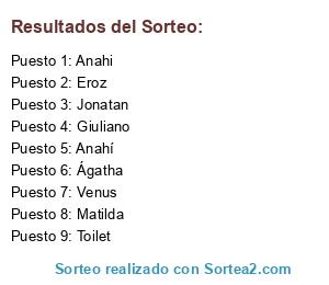 Lista de participantes: Anahi, Anahí(2 participaciones), Jonatan(3 participaciones), Giuliano(3 participaciones), Eroz, Matilda, Ágatha, Venus, Toilet.