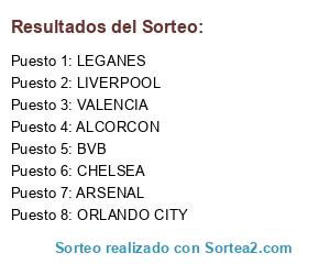 Lista de participantes: ORLANDO CITY, BVB, ALCORCON, CHELSEA, VALENCIA, LIVERPOOL, LEGANES, ARSENAL.