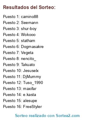 Lista de participantes: Vegeta, DjMummy, maxifar, Seemann, Wokooo, statham, camino88, nencito_, Tuso_1990, Dogmasakre, Takuato, e.kasta, shur-boy, alesupe, Jesuselx, FreeStyler.