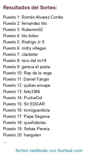 Lista de participantes: tomiiguardiola, tito bolso, Sir.EDGAR, Sebas Perera, Rubennn02, roberto gelista, Román Alvarez Cortés, rodry villegas, Rodrigo Jr S, Ray de la vega, quuiñobolso, quilian envape, PucheGol, Pape Segovia, nico del rio18, hangsten, gareca el posta, feto3386, fernandez tito, Daniel Fangio, clackster, Cabeza2121.