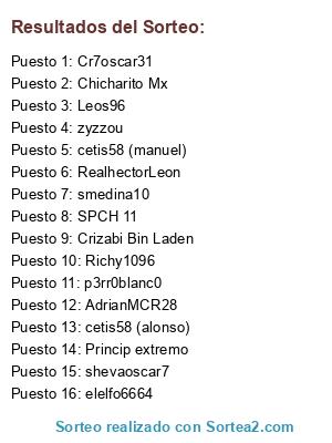 Lista de participantes: shevaoscar7, SPCH 11, cetis58 (manuel), cetis58 (alonso), Princip extremo, Cr7oscar31, smedina10, Chicharito Mx, zyzzou, p3rr0blanc0, RealhectorLeon, Richy1096, Leos96, Crizabi Bin Laden, elelfo6664, AdrianMCR28.