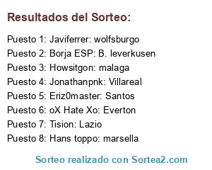 Lista de participantes: oX Hate Xo: Everton, Borja ESP: B. leverkusen, Javiferrer: wolfsburgo, Jonathanpnk: Villareal, Tision: Lazio, Eriz0master: Santos, Howsitgon: malaga, Hans toppo: marsella.