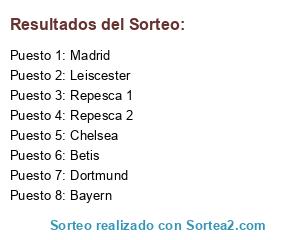 Lista de participantes: Leiscester, Bayern, Madrid, Chelsea, Dortmund, Betis, Repesca 1, Repesca 2.