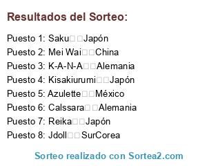 Lista de participantes: Calssara Alemania, Reika Japón, Jdoll SurCorea, Kisakiurumi Japón, Azulette México, K-A-N-A Alemania, Mei Wai China, Saku Japón.