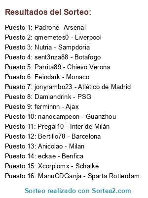 Lista de participantes: Anicolao - Milan, Bertillo78 - Barcelona, Damiandrink - PSG, eckae - Benfica, ferminnn - Ajax, Parrita89 - Chievo Verona, jonyrambo23 - Atlético de Madrid, ManuCDGanja - Sparta Rotterdam, nanocampeon - Guanzhou, Nutria - Sampdoria, Pregal10 - Inter de Milán, qmemetes0 - Liverpool, sent3nza88 - Botafogo, Padrone -Arsenal, Xcorpiomx - Schalke, Feindark - Monaco.