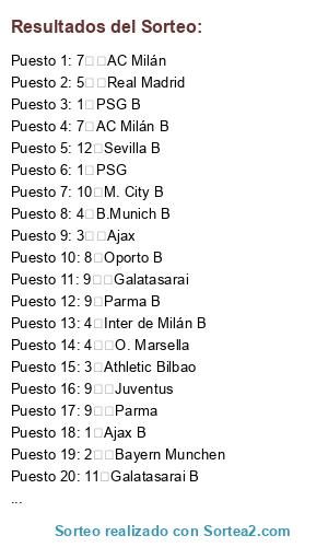 Lista de participantes: 1 Oporto, 2 Fiorentina, 3 Málaga CF, 4 Inter de Milán, 5 Real Madrid, 6 Liverpool, 7 AC Milán, 8 Atlético de Madrid, 9 Parma, 9 Juventus, 1 Chelsea, 2 Bayern Munchen, 3 Ajax, 4 O. Marsella, 5 Real Madrid B, 6 River Plate, 7 Córdoba, 8 Sevilla FC, 9 Galatasarai, 10 Xerez, 1 Ajax B, 2 PSV Eindhoven, 3 Athletic Bilbao, 4 Liverpool B, 5 Juventus B, 6 Napoli, 7 Real Betis, 8 RCD La Coruña, 9 Parma B, 10 Borussia Dortmund, 1 PSG, 2 Chelsea B, 3 Fiorentina B, 4 B.Munich B, 5 River Plate B, 6 Atlético de Madrid B, 7 Málaga B, 8 Oporto B, 9 Valencia FC, 10 Manchester City, 10 Borussia Dortmund B, 12 Sevilla B, 1 PSG B, 2 O. Marsella B, 3 Xerez B, 4 Inter de Milán B, 5 Ath. Bilbao B, 6 PSV B, 7 AC Milán B, 8 Valencia FC B, 9 Napoles B, 10 M. City B, 11 Galatasarai B, 12 Real Betis B.