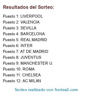 Lista de participantes: REAL MADRID, LIVERPOOL, MANCHESTER U., INTER, CHELSEA, ROMA, VALENCIA, AT DE MADRID, JUVENTUS, BARCELONA, SEVILLA, AC MILAN.
