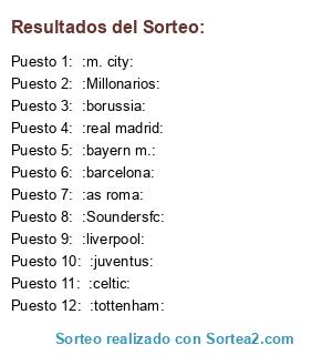 Lista de participantes: :barcelona: , :bayern m.: , :borussia: , :celtic: , :juventus: , :liverpool: , :m. city: , :Millonarios: , :real madrid: , :as roma: , :Soundersfc: , :tottenham: .