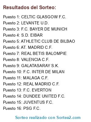 Lista de participantes: REAL MADRID C.F., F.C. INTER DE MILAN, DUNDEE UNITED F.C., S.D. EIBAR, REAL BETIS BALOMPIE, GALATASARAY S.K., MALAGA C.F., JUVENTUS F.C., VALENCIA C.F., F.C. BAYER DE MUNICH, ATHLETIC CLUB DE BILBAO, PSG F.C., CELTIC GLASGOW F.C., LEVANTE U.D., F.C. EVERTON, AT. MADRID C.F..